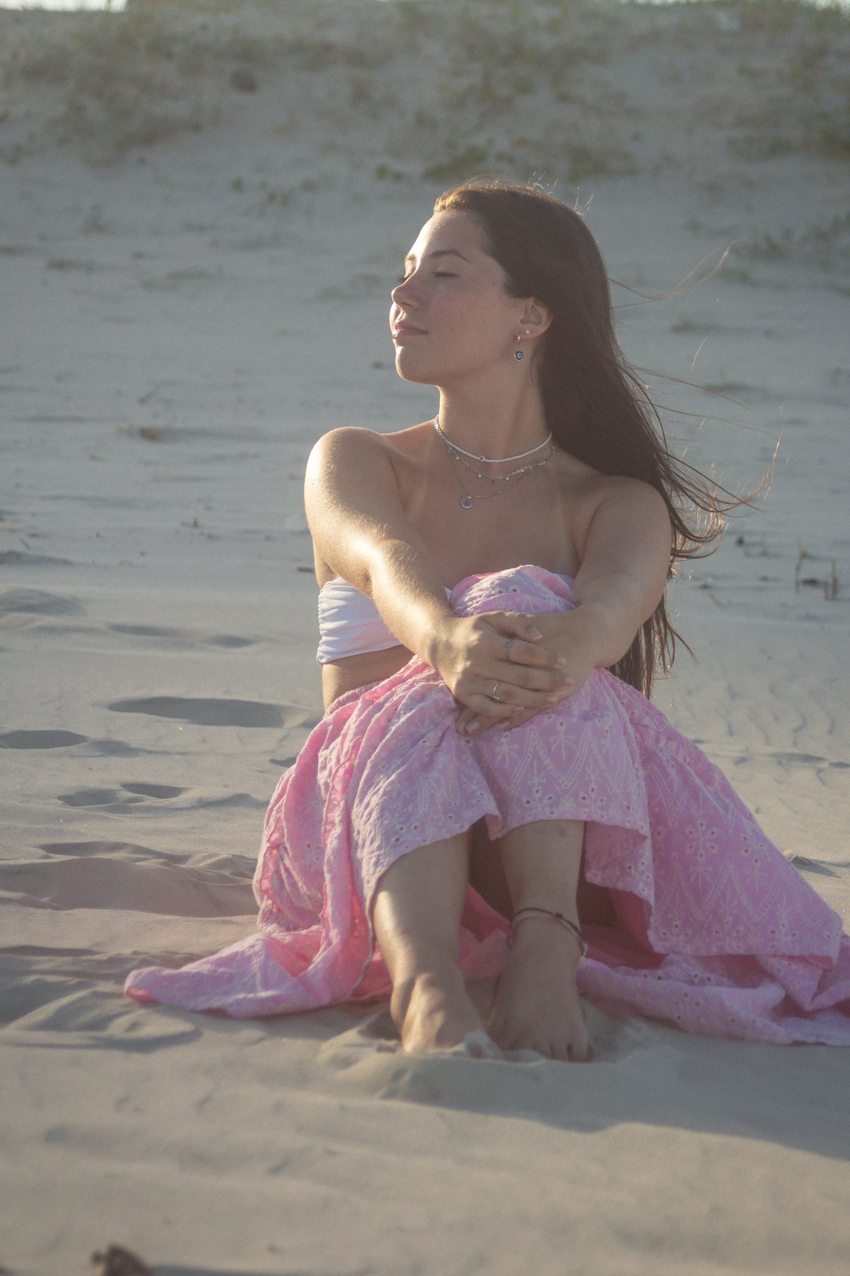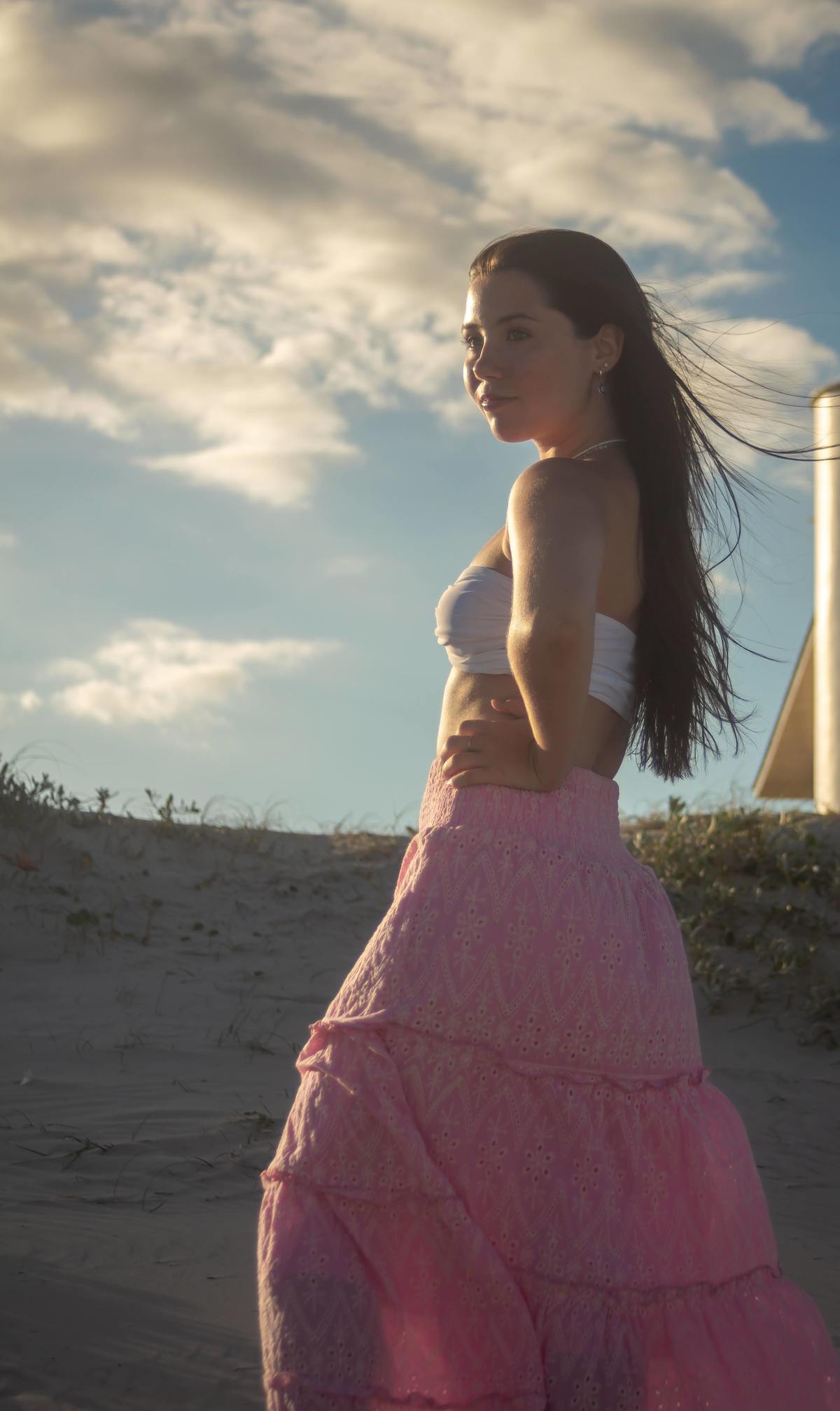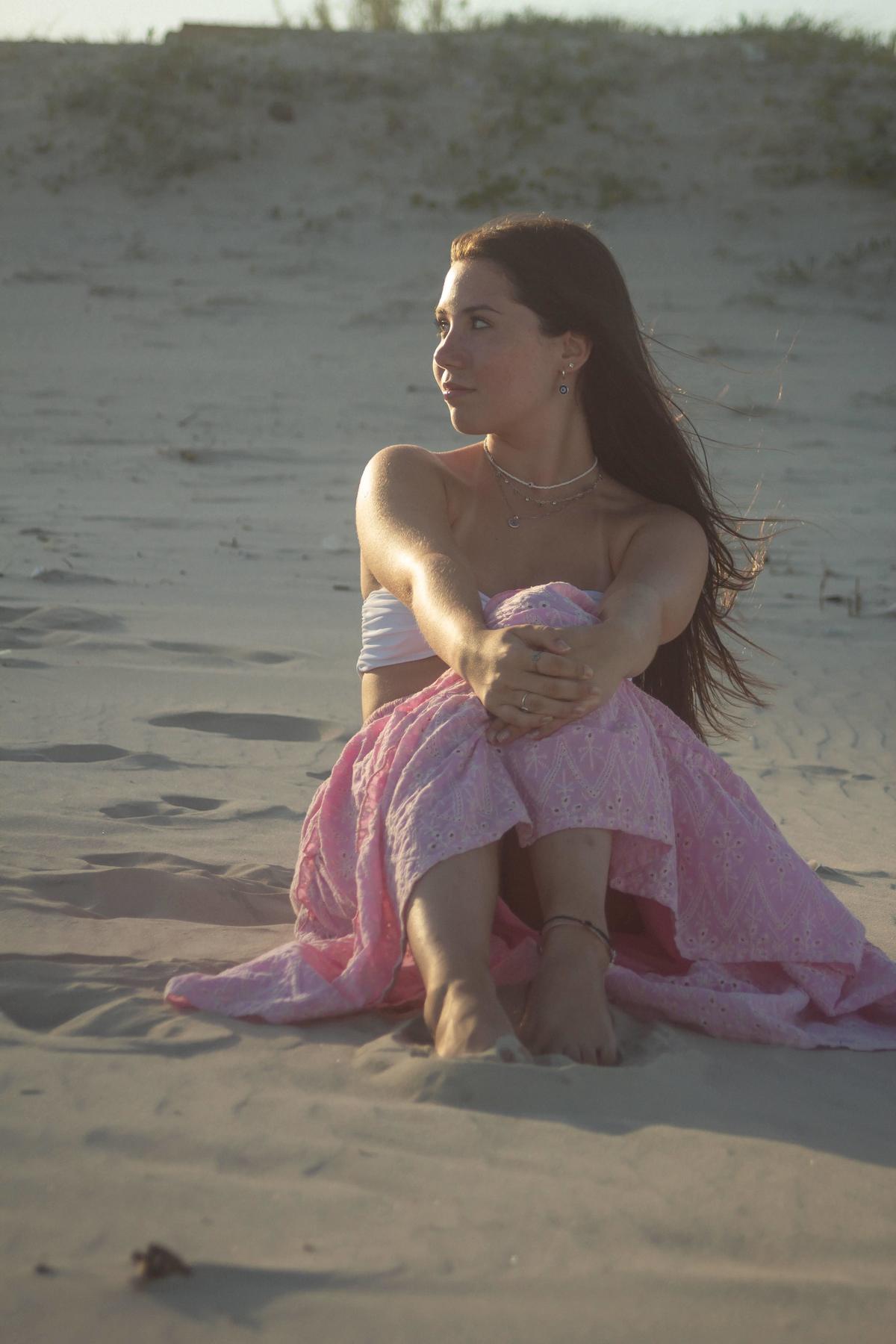 Com o sol se pondo ao fundo, o cenário proporcionou a suavidade e a naturalidade que ela desejava. As imagens refletem sua conexão com o presente, como se cada gesto e olhar fosse uma metáfora para sua jornada, expressando a beleza dessa fase de introspecção e harmonia.